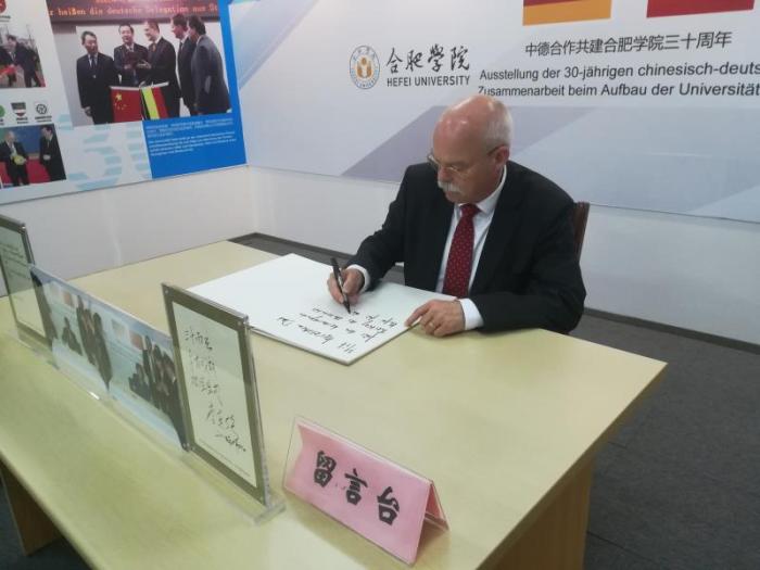 隨后,雙方參觀了中德合作共建合肥學院成果展。蔡敬民、王其東為葛策博士一行詳細講解。蔡敬民表示,合肥學院是一所在“改革中誕生、開放中成長、創新中發展”的地方本科院校,早在2003年就提出“地方性、應用型、國際化”的辦學定位,三十多年來通過借鑒德國應用科學大學辦學經驗,結合中國實踐構建應用型人才培養體系,促進自身發展的同時,也示范引領了眾多國內地方高校的轉型發展。