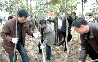 2∶50,我們趕到了南艷湖校區植樹現場。遠遠望見“植樹護綠、美化校園”的大紅橫幅格外醒目。已先趕到的南艷湖校區院直機關部分黨員正干得起勁兒,40多棵小樹苗已“亭亭玉立”。此時8個支部匯到了一起,分工有序,各司其職,有挖樹坑小組,運樹苗小組,種樹小組,澆水小組,還有“引水工程隊”。他們個個身手敏捷,動作利落,同時又小心翼翼,惟恐損傷了剛剛種下的“小生命”。一個個生動感人的場面讓我一次又一次拉起鏡頭,按下快門。