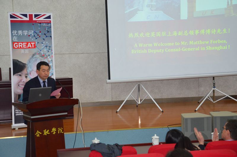 報告會伊始,院長張文兵致歡迎詞,代表學院對傅博詩先生一行表示歡迎。張文兵說,自1985年以來,合肥學院積極開展國際交流與合作,先后與德國、韓國、日本、美國等國家和地區的44所高校建立友好的合作關系,形成了鮮明的國際化辦學特色。此次傅博詩先生的來訪將為我院師生獻上豐富多彩的英國文化大餐,必將推動師生們對英國文化、歷史及中英文化交流的新認識和興趣培養,為中英文化的交流起到牽線搭橋的作用。