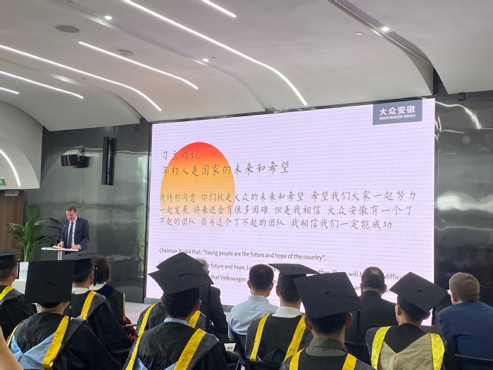 Am 16. Juni schloss die erste Gruppe der von der Universit?t Hefei in Zusammenarbeit mit dem Volkswagen Konzern ausgebildeten ?Nachwuchsingenieure“ ihre Ausbildung erfolgreich ab. Die Pr?sidentin der Universit?t Hefei Wu Chunmei nahm an der von Volkswagen Anhui veranstalteten Abschlussfeier teil. Herr Jens Pfitzinger, stellvertretender Vizedirektor des Volkswagen Konzerns (China), Dr. Gabardi, Chief Executive Officer bei Volkswagen (Anhui), Herr Schneider, Chief Manufacturing Officer, Dr. Ludger Lührmann, Chief Technical Officer, Herr Jian Shao, Chief Human Resources Officer sowie Führungskr?fte und Lehrkr?fte aus dem Büro des Pr?sidenten, dem Büro für akademische Angelegenheiten, dem Büro für internationalen Austausch und Zusammenarbeit, demInstitut of Advanced Manufacturing Engineering und dem Institut of Artificial Intelligence and Big Data nahmen an der Abschlussfeier teil.