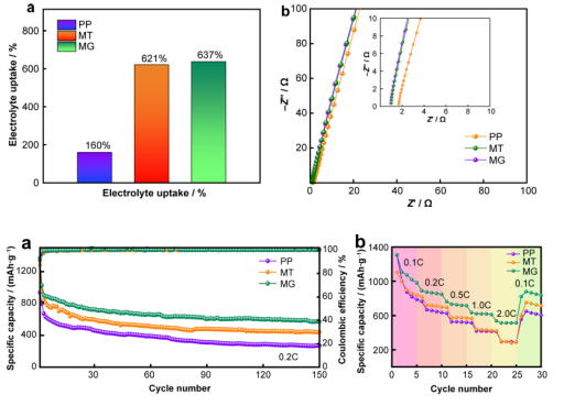 團隊進一步開發了Super P與MoO?/MoS?共摻雜的梯度納米纖維膜。該設計在負極側(純明膠層)促進均勻鋰離子流,在正極側通過物理化學吸附增強多硫化物轉化,為鋰硫電池商業化提供了新思路。成果以“Super P and MoO2/MoS2 co-doped gradient nanofiber membrane as multi-functional separator for lithium–sulfur batteries”為題發表在《Rare Metals》。梁鑫為第一作者及通訊作者,合肥大學能源材料與化工學院為第一完成單位。