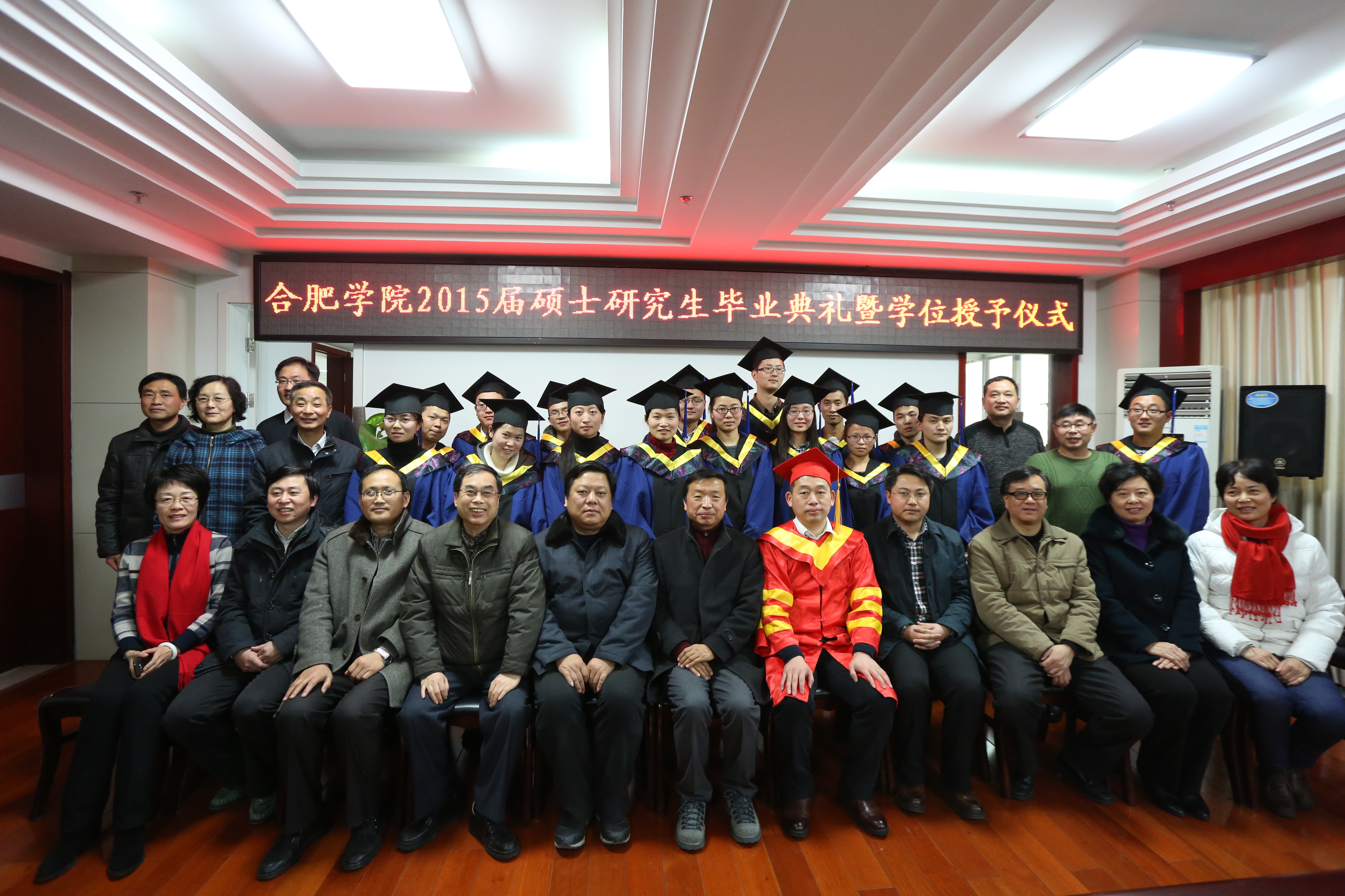 首先,我校學(xué)位評定委員會委員副主任、副校長陳嘯宣讀合肥學(xué)院學(xué)位評定委員會“關(guān)于授予2015屆環(huán)境工程專業(yè)王先琴等16名研究生工程碩士學(xué)位的決定”,副校長丁明宣讀“關(guān)于表彰合肥學(xué)院2015屆碩士研究生優(yōu)秀畢業(yè)生、優(yōu)秀畢業(yè)論文和‘安徽合大環(huán)保獎學(xué)金’獲得者的決定”。隨后,校長張文兵為16位碩士研究生頒發(fā)畢業(yè)證書、學(xué)位證書和撥流蘇、合影,副校長丁明為五位“優(yōu)秀畢業(yè)生”頒發(fā)獲獎證書,學(xué)生處處長董承軍和生環(huán)系主任張潔為獲得“優(yōu)秀畢業(yè)論文獎”的四位同學(xué)頒發(fā)證書,安徽南風(fēng)環(huán)境工程有限公司總經(jīng)理韓厚強為綜合排名第一的王先琴同學(xué)頒發(fā)“安徽合大環(huán)保獎學(xué)金”證書和2萬元獎金,合大環(huán)境檢測有限公司總經(jīng)理韓蔚為綜合排名第二的郭鵬飛同學(xué)頒發(fā)“安徽合大環(huán)保獎學(xué)金”證書和1萬元獎金。