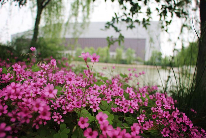 轉(zhuǎn)而天晴,三三兩兩的同學(xué)在這綠地上或讀書,或私語(yǔ),或討論比賽;暖陽(yáng)灑在他們洋溢著朝氣的臉上,似要竊聽學(xué)子的秘密。偶有鳥雀飛來(lái),于樹梢喳喳追逐,人與自然和諧于春色融融之中。櫻花園粉鋪成片,團(tuán)花簇錦,清芬飄溢;紫薇林云凈風(fēng)清,含苞將放,初透芳菲。人與蜂蝶相追,花共鳥雀起舞。春回大地,欣欣向榮。