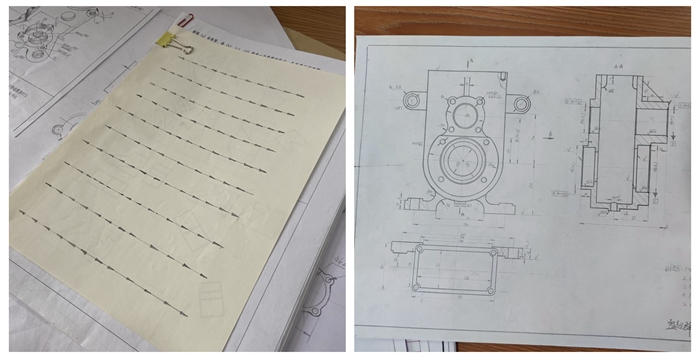 在劉丹萍老師的辦公桌上,疊放著各種尺寸的工科圖紙、日常的課程構(gòu)型集訓(xùn)題和指導(dǎo)學(xué)生參賽的繪圖試卷,小山一樣的材料將她團(tuán)團(tuán)圍住,雖然已經(jīng)記不清修改了多少遍,但她對班上每個學(xué)生的作圖風(fēng)格如數(shù)家珍。