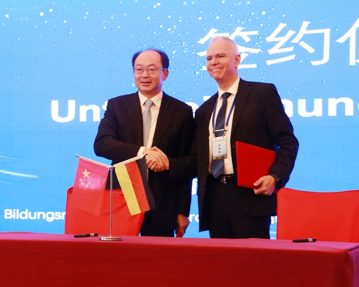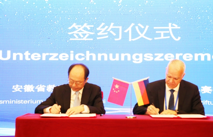 大會舉行了簽約儀式,錢桂侖和喬治·施泰德作為雙方代表簽訂了合作協議。未來雙方將圍繞“教學方案研討”、“提升教師教學以及實踐能力”、“引入以實踐為導向教學理念”為主題的師資培訓,建立建設能力培訓中心,建立教學質量管理體系等方面開展合作,進一步增進中德兩國在教育領域的交流與友誼,促進安徽省職業教育發展。