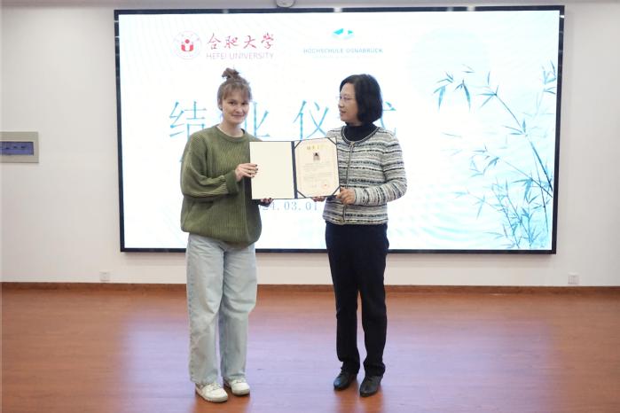 在結業儀式上,校長吳春梅給所有通過考核的學生頒發結業證書。勉勵德國學生繼續學習中文和中國文化,歡迎他們來合肥大學留學,做中德教育合作的參與者和中德友好關系的傳播者。