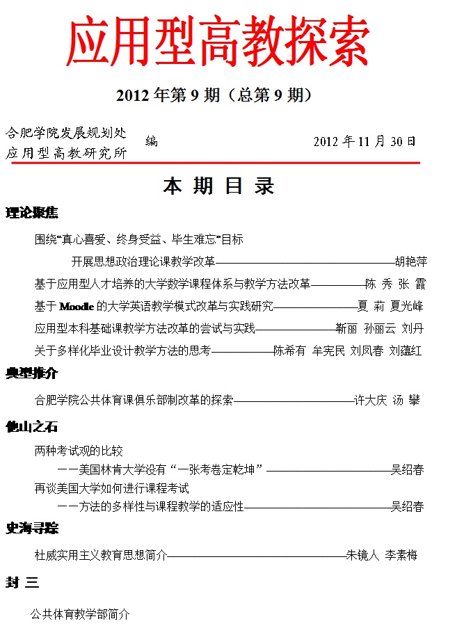 《應用型高教探索》第 9 期以“公共課教學改革和課程考核方式改革”為主題組稿,目錄如下,具體內容請查閱發展規劃處網站,并將您的寶貴意見或建議反饋至我處。 第 10 期擬以“區域高校合作與國際高校合作”為主題組稿,歡迎大家積極投稿或推薦相關文章。 聯 系 人:陶龍澤 聯系電話:62159213 郵 箱:fzghc@hfuu.edu.cn. 發展規劃處 應用型高教研究所 二○一二年十一月三十日