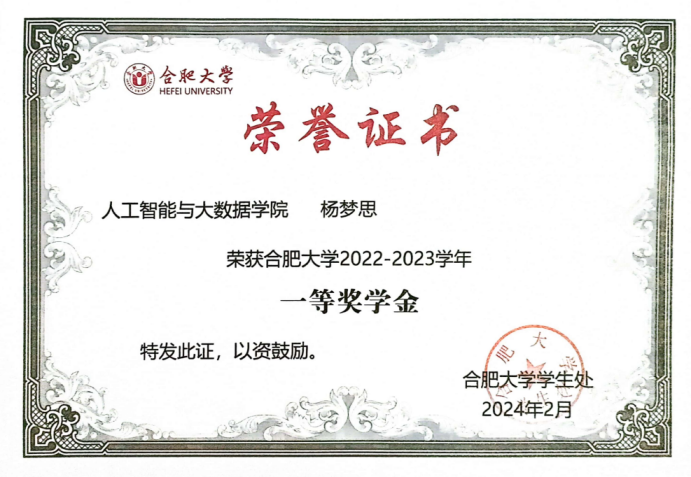 楊夢思,女,漢族,安徽阜陽人,2003年2月生,合肥大學人工智能與大數據學院2021級數學與應用數學(師范)2班學生,中共黨員。現任班級團支書,2023-2024學年體育俱樂部聯盟主席團成員。