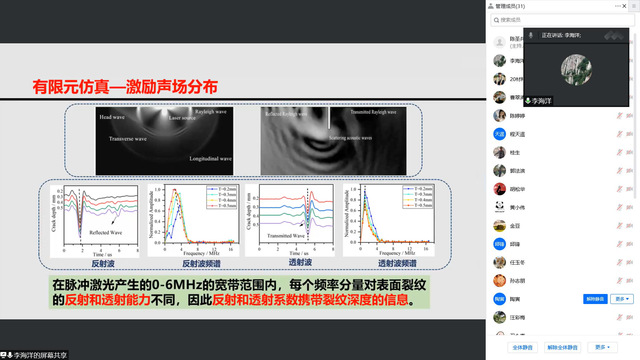 李海洋老師報告主題是基于激光超聲技術的表面裂紋深度定量檢測。介紹根據表面波在缺陷處的透射/反射閾值現象,并重點介紹了最新激光超聲臨界頻率法,實現表面微缺陷的定位及深度檢測技術,以及激光超聲監測與大數據、AI的結合提高裂紋監測精度的分析技術設想。