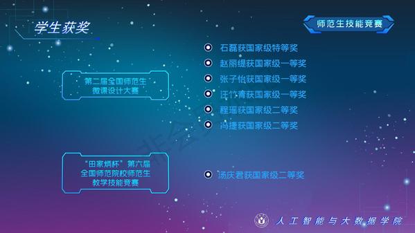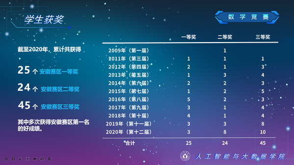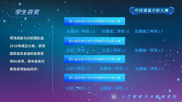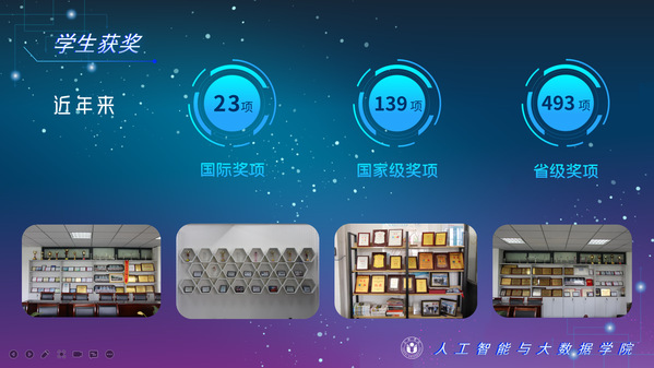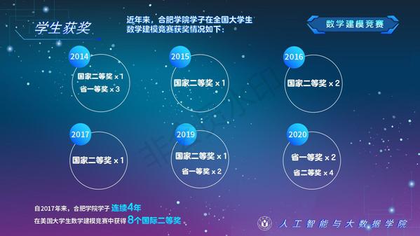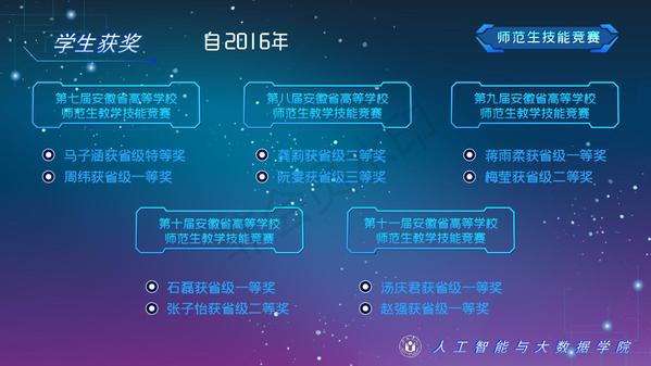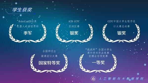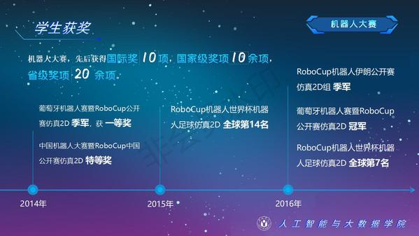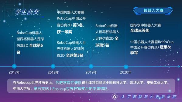 人工智能與大數據學院緊緊圍繞學校人才培養中心工作,2012年以來積極開展以學生科技創新創業為主的第二課堂工作,以學生“能力水平、專業類別和興趣愛好”為根本出發點,目前成立了: RoboCup機器人足球、數學建模、AR/VR團隊、物聯網創新設計、移動應用開發、ACM-ICPC算法設計、仿人機器人、水下機器人、區塊鏈、網絡與信息安全等16支團隊,并且專門建設了機器視覺應用、數學建模與仿真等6個學生創新實驗室、移動APP開發、多智能體系統、數據分析與仿真等8個大學生創客中心;為各團隊提供良好的環境和資源。通過這些工作的開展,人工智能與大數據學院大學生的創新創業能力逐步增強,目前有200余人常駐創新創業實驗室。近五年在師生共同努力下,在各類競賽中共獲獎800項,其中國際級21項,國家級獎項160余項、省級獎項600余項。RoboCup機器人2D仿真足球隊連續5次進入世界杯前8強,先后獲得葡萄牙公開賽冠軍、世界杯季軍等國際獎項是世界杯、中國機器人足球賽公認強隊;此外獲得中國機器人大賽暨RoboCup公開賽曾獲得國家特等獎1項、美國大學生數學建模競賽獲得國際二等獎6項,全國大學生數學建模競賽獲得國家二等獎1項,CCPC中國大學生程序設計競賽總決賽銀牌,Robocup機器人世界杯中國賽獲得亞軍,“哈工大杯”第十六屆全國機器人錦標賽暨“博思威龍杯”第五屆國際仿人機器人奧林匹克大賽獲得國家一等獎2項,“藍橋杯”全國軟件和信息技術專業人才大賽個人賽曾獲得國家一等獎2項,“田家炳杯”第六屆全國師范院校師范生教學技能競賽國家二等獎、第二屆全國師范生微課設計大賽國家特等獎等。獲批大學生創新創業訓練計劃項目國家級86項,省級168項,獲批大學生創客實驗室項目8項,2名優秀學生獲得安徽省“創新之星”榮譽稱號。