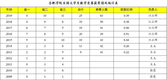 大學數學競賽團隊成員包括12名專任教師,其中教授2人,副教授6人,講師4人。40歲以下青年教師有8人,其中具有博士學位3人,年齡結構、職稱結構合理。團隊自2009年組織大學生數學競賽以來,先后有100多人獲得省級獎項。通過參加大學生數學競賽,激發了學生學習數學的興趣,培養了學生的數學素養,對高等學校數學課程建設的改革和發展起到了重要的推動和促進作用。