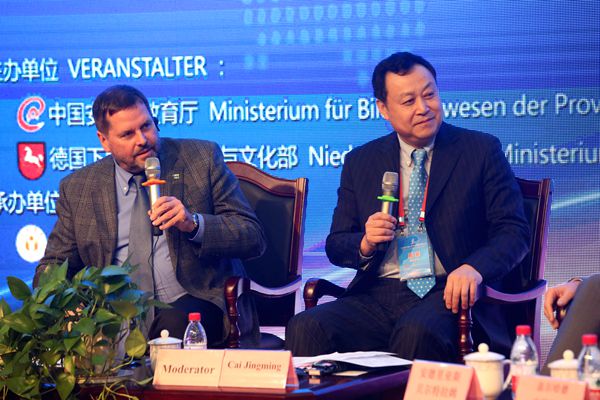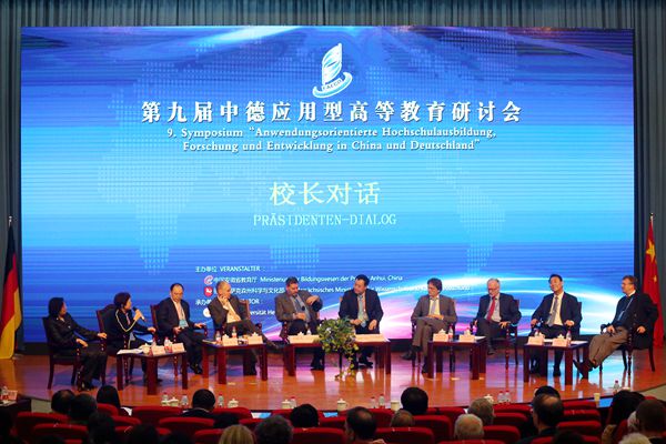 對話啟動前,來自中德兩國的8位校長依次介紹了各自學(xué)校情況。蔡敬民首先首先向在座的德國校長提出兩個問題:如何看待歐洲文化一體化及德國應(yīng)用型大學(xué)教育發(fā)展的前景?德國大學(xué)的專業(yè)設(shè)置是否具有國家標(biāo)準(zhǔn)?德國奧斯納布呂克應(yīng)用科學(xué)大學(xué)校長貝爾特拉姆坦言這是一個很有意義的問題,在歐洲的文化潮流中,思考如何將應(yīng)用型教育與之融合也是他們正在研究的問題。安哈爾特應(yīng)用科學(xué)大學(xué)校長巴格丹教授表示,國家對學(xué)校設(shè)置專業(yè)都有一定的標(biāo)準(zhǔn),德國教育管理部門也組織了認(rèn)證機(jī)構(gòu)對大學(xué)專業(yè)的具體內(nèi)容以及對學(xué)生的具體影響進(jìn)行考察,學(xué)校再結(jié)合自身特色以及保持學(xué)生未來發(fā)展空間的情況下設(shè)置合理專業(yè)。