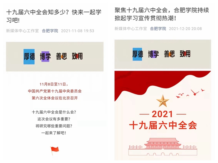 著力創(chuàng)新學(xué)習(xí)載體,全面增強學(xué)習(xí)實效。合肥學(xué)院充分發(fā)揮各級各類媒體的作用,加大宣傳力度,校園官網(wǎng)上線“學(xué)習(xí)貫徹黨的十九屆六中全會精神”熱點專題、“學(xué)習(xí)進行時”專欄,學(xué)校官方微信公眾號及時推送黨的十九屆六中全會相關(guān)推文,制作十九屆六中全會專題簡報等等,通過線上線下一體化宣傳,不斷豐富擴充學(xué)習(xí)渠道和資源,全方位宣傳解讀十九屆六中全會精神內(nèi)涵,常態(tài)化報道展示全校上下學(xué)習(xí)貫徹全會精神相關(guān)情況,掀起學(xué)習(xí)宣傳貫徹十九屆六中全會精神的熱潮。