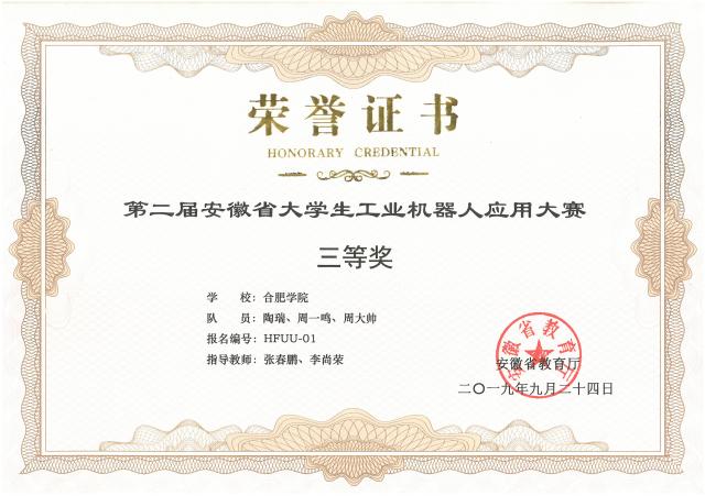 我校機械工程系于2019年9月第一次組隊參加了第二屆安徽省大學生工業機器人應用大賽,共1支參賽隊伍3人參賽;獲得省級三等獎1項。