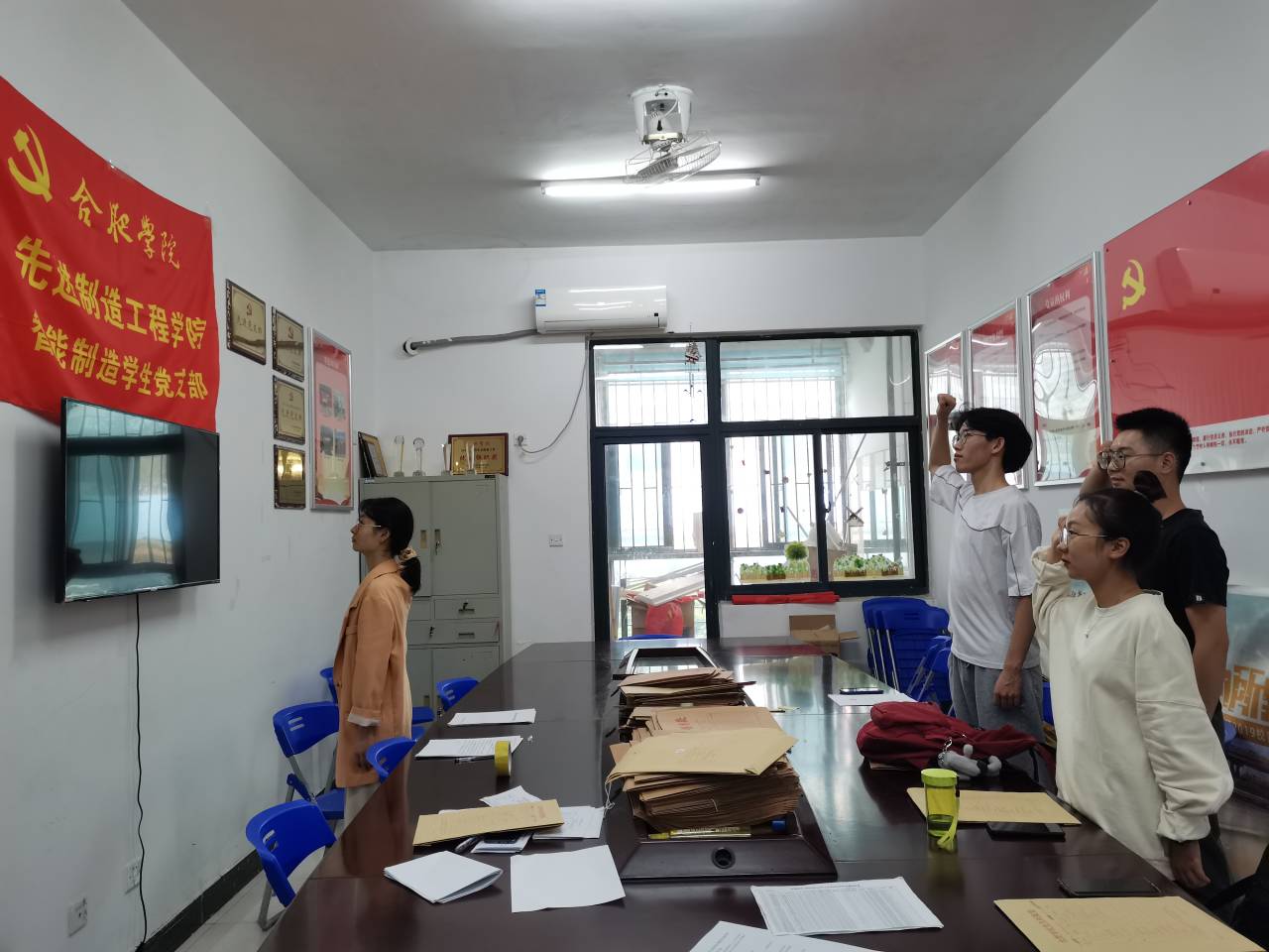 會(huì)議初始主持人宣讀大會(huì)議題。關(guān)于劉瀟瀟等4位同志轉(zhuǎn)為正式黨員以及接收李婕等3位同志為中共預(yù)備黨員的事宜。隨后全體起立,奏唱國(guó)歌,
