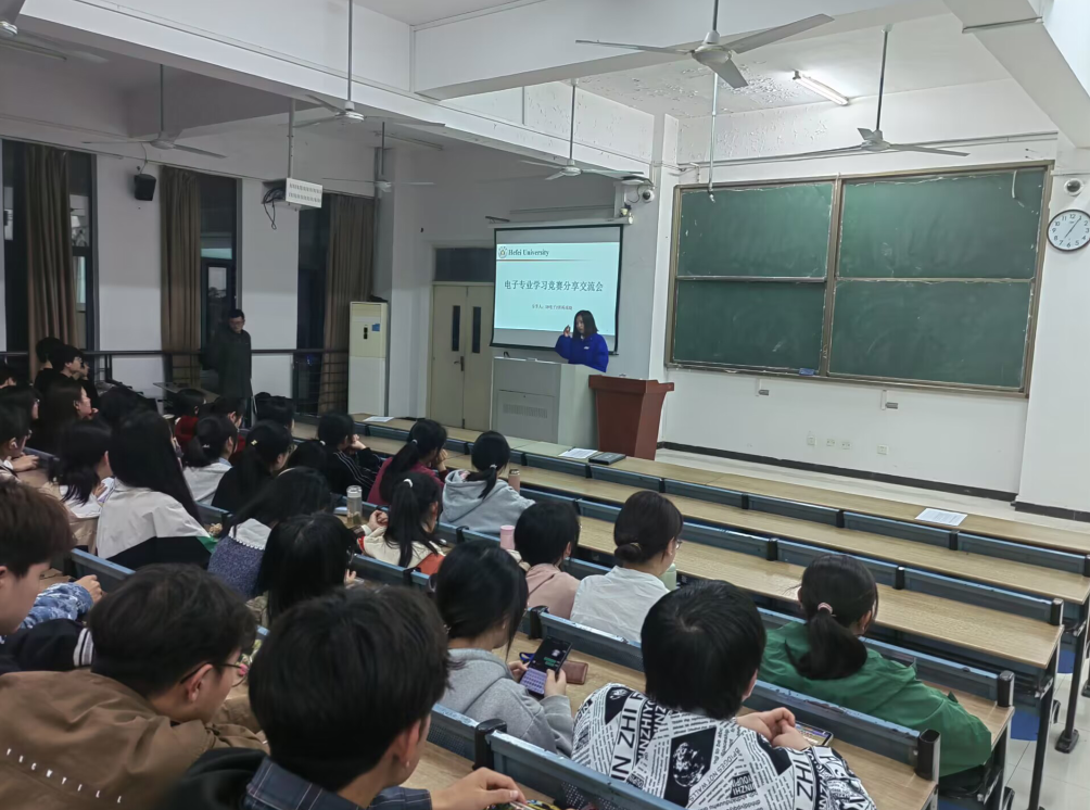 接著,國家獎學金獲得者、19電子信息工程2班楊成曉就電子信息工程專業可以參加的比賽、大學階段性的規劃、考證與志愿活動等為學弟學妹們做了學業規劃指導與學習經驗分享。與電子信息工程專業緊密聯系的比賽有:電子設計大賽、智能車競賽、單片機競賽、西門子杯挑戰賽、機器人競賽,專業相關比賽有:物理學術競賽、物理實驗競賽、數學建模競賽、互聯網+比賽、挑戰杯競賽、大創比賽等。她就大一、大二、大三分別適合參加哪些比賽,提出了建議。大學里還可以考教師資格證、國家計算機二級、普通話證書、大學英語四六級等。另外,楊成曉鼓勵學弟學妹們積極參加志愿服務活動,并就自己如何處理工作和學習的關系做了經驗分享。