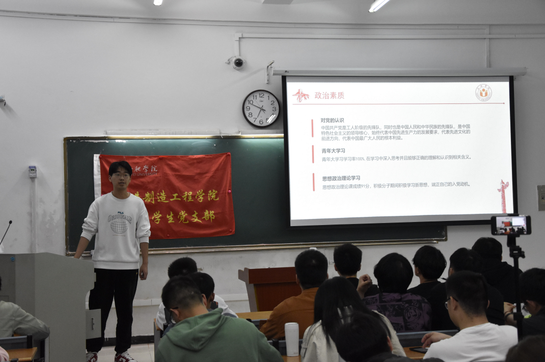 最后,每位正式黨員公正客觀地對匯報人的綜合表現進行現場評分,最終20機制2班李子衡獲得89.61分,21機制1班李博弈獲得83.94分,21機制3班程薇獲得82.78分,21機制2班楊博涵獲得82.22分,21機制2班李緒沖獲得80分并均被確定為本學期的發展對象。
