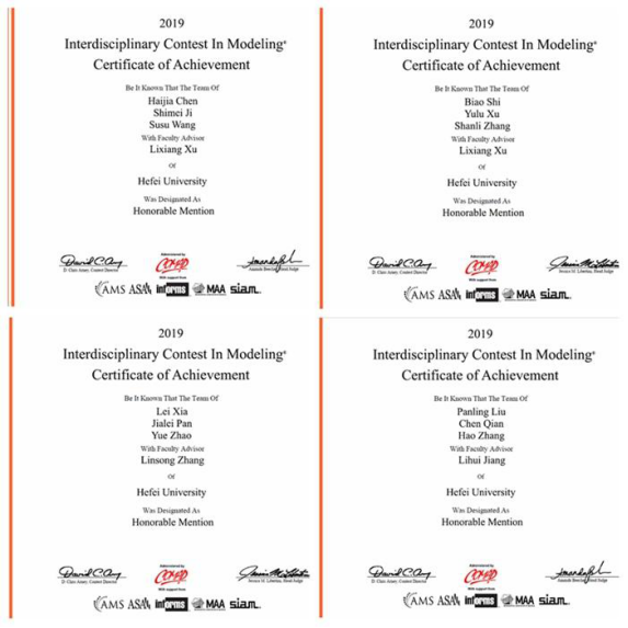Twelve HFU students from the Department of Mathematics & Physics, Electronic Information & Electrical Engineering, and Mechanical Engineering respectively win Honorable Mention prizes(Second Prize) in 2019 USA Interdisciplinary Contest in Modeling(ICM) under the supervision of their tutors.
