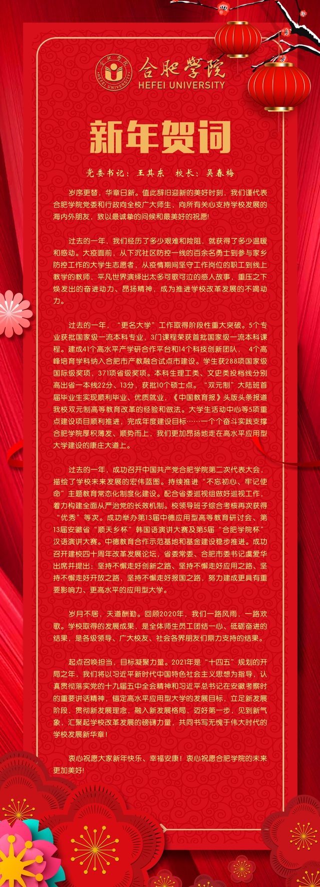The year changes and our life chapter is renewed. On behalf of Hefei University Council, we would like to extend our sincere greetings and best wishes to all Hefei University teachers and students as well as all our friends at home and abroad, caring about and supporting the development of Hefei University!