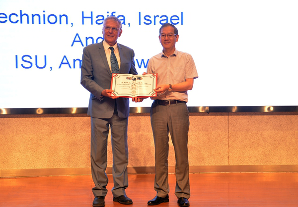 On September 21st , Professor Danieres Shekhtman, the 2011 Nobel Prize winner(Chemistry), is invited to give a lecture on “scientific innovation” at HFU and Professor Wang Qidong, president of HFU, awards him the “Honorary Professor” certificate.