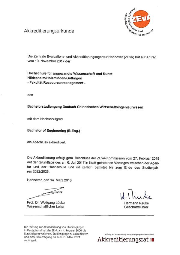 Im Juli 2017 wurde der Akkreditierungsantrag bei der zentralen Evaluierungs- und Akkreditierungsagentur gemeinsam von der Universit?t Hefei und der Hochschule für angewandte Wissenschaft und Kunst Hildesheim/Holzminden/G?ttingen gestellt. Um die Akkreditierung zu vollenden, führte die Evaluations- und Akkreditierungsagentur Interviews und Lernmaterialkontrollen durch. Auch Videokonferenzen wurden geführt. Diese Erhebungen basierten auf vorherigen Kontrollen.