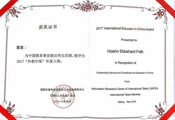 Es war besonders erw?hnenswert, dass der Preis ?2017 ausl?ndische Lehrer in China“ einer Gruppe von hervorragenden ausl?ndischen kulturellen und p?dagogischen Experten verliehen wurde. Herr Professor H?hn, stellvertretender Pr?sident unserer Universit?t, erhielt auch diese Auszeichnung. Im Namen ihres Vaters kam Frau Theresa H?hn zur Tsinghua-Universit?t und nahm die Auszeichnung entgegen.