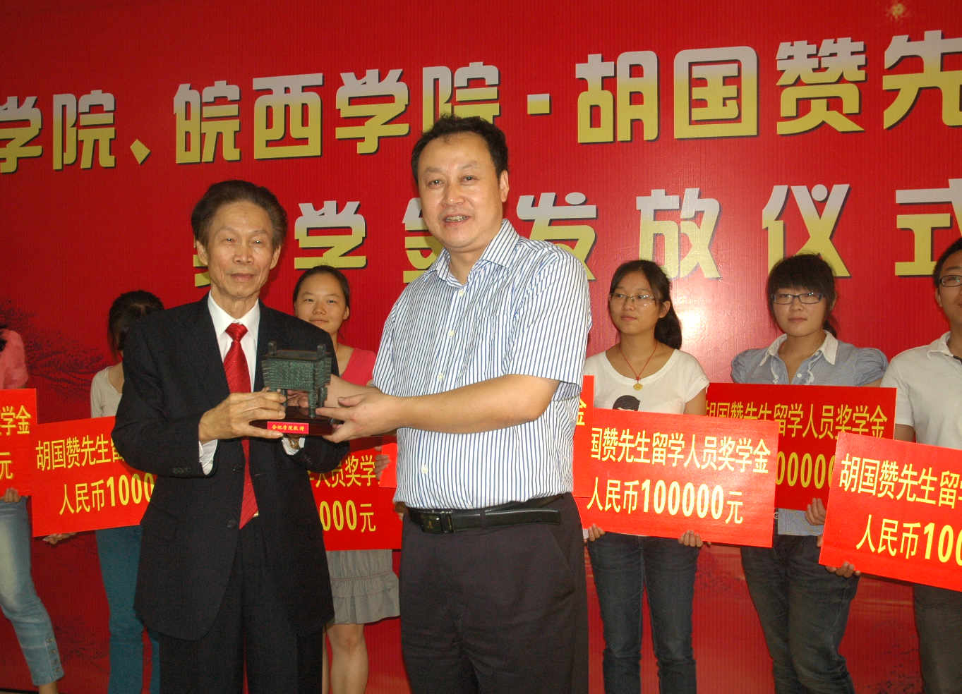 8月16日,世界胡氏宗親聯合總會資助出國留學生的獎學金發放儀式在合肥學院隆重舉行。世界胡氏宗親聯合總會會長、香港金龍科技集團董事局主席胡國贊先生分別向學院5名即將赴美留學的同學發放了獎學金(每人一次性10萬元的留學獎學金)。