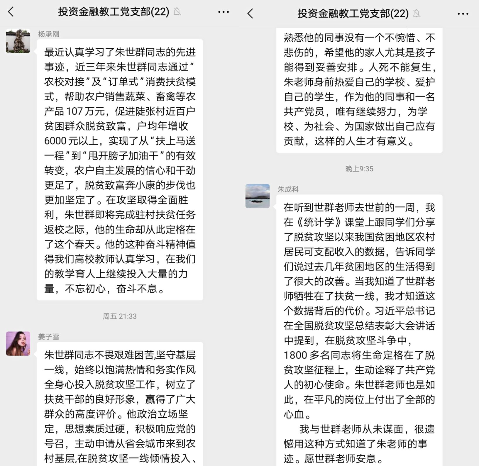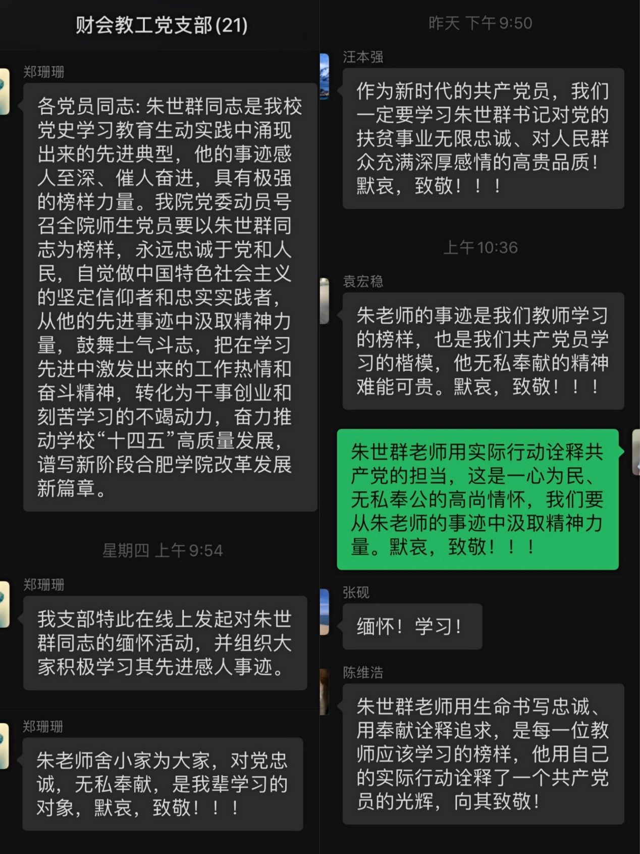 物流教工黨支部開展線下座談會,全體黨員教師懷著極其沉痛的心情觀看了安徽新聞聯播中關于對朱世群老師事跡的報道,對朱老師進行緬懷和深刻的悼念。投資金融黨支部,經貿支部黨員老師和財會教工黨支部在線上發起對朱世群同志的緬懷活動,并組織全體黨員積極學習其先進感人事跡。