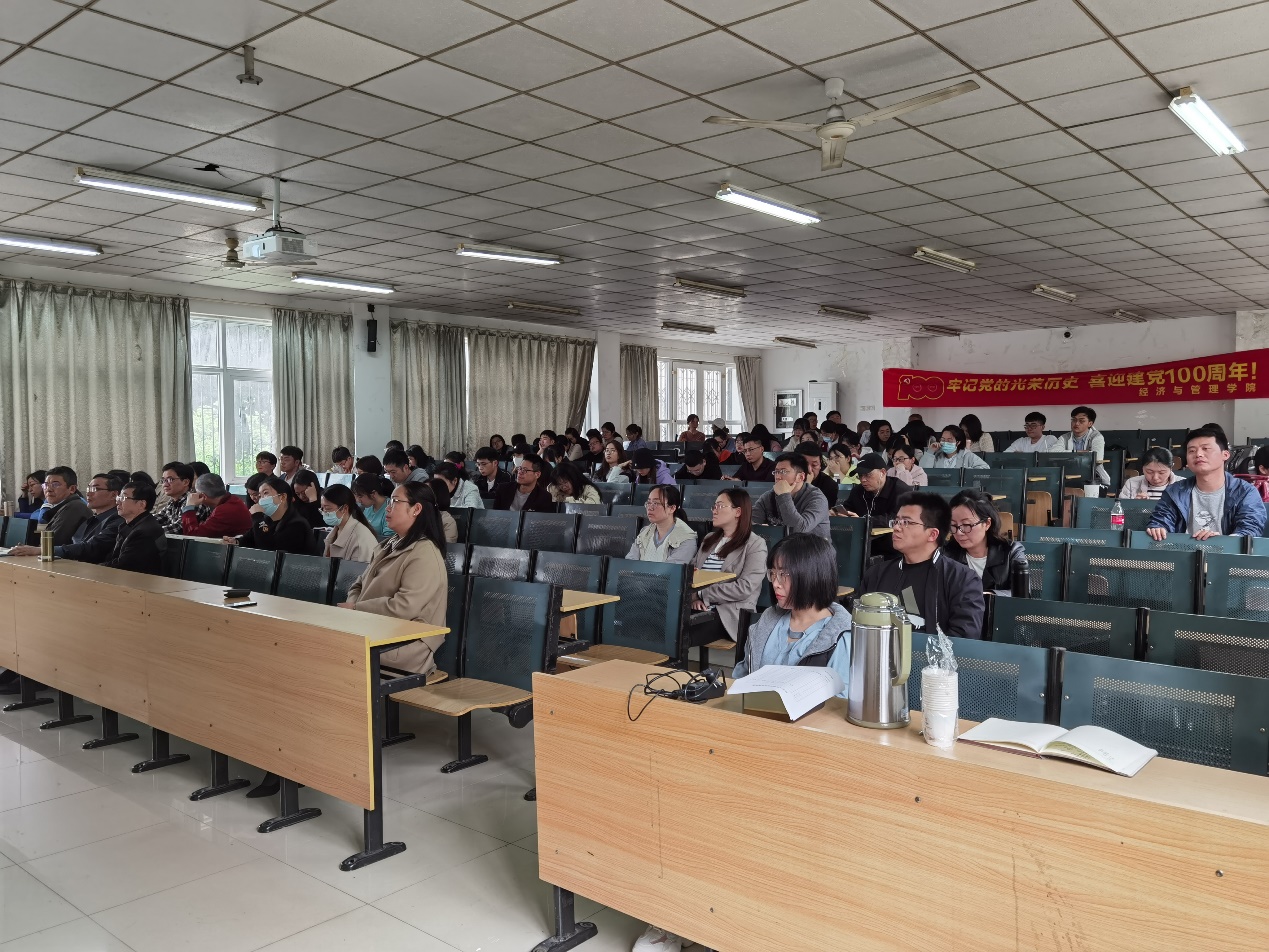 在報告會開始前,經濟與管理學院黨委書記楊學春首先帶領黨員同志學習了習近平總書記在清華大學考察時發表的重要講話,并強調要將黨史學習同人才培養、科學研究、服務地方、文化傳承、國際合作與交流以及大學生職業規劃相結合起來,期望全院師生凝心聚力,同心同德,從認識上、行動上、成效上和落實上,深刻領會貫徹學習習近平總書記2月20日在黨史學習教育動員大會上的重要講話,為經管學院從大院變成強院,為建設高水平應用型大學再立新功。