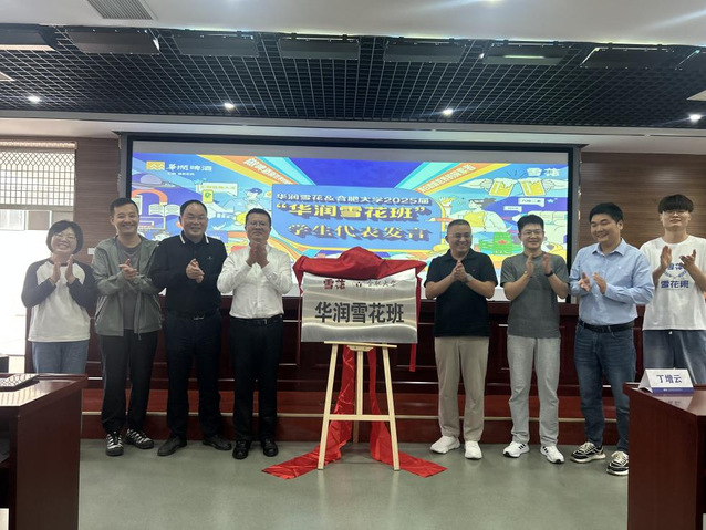 儀式上,學校、學院領導與華潤雪花啤酒(安徽)有限公司代表共同為“華潤雪花班”揭牌。雙方就未來合作的具體事項進行了深入交流,并表示將繼續深化合作,實現資源共享、優勢互補、合作共贏。