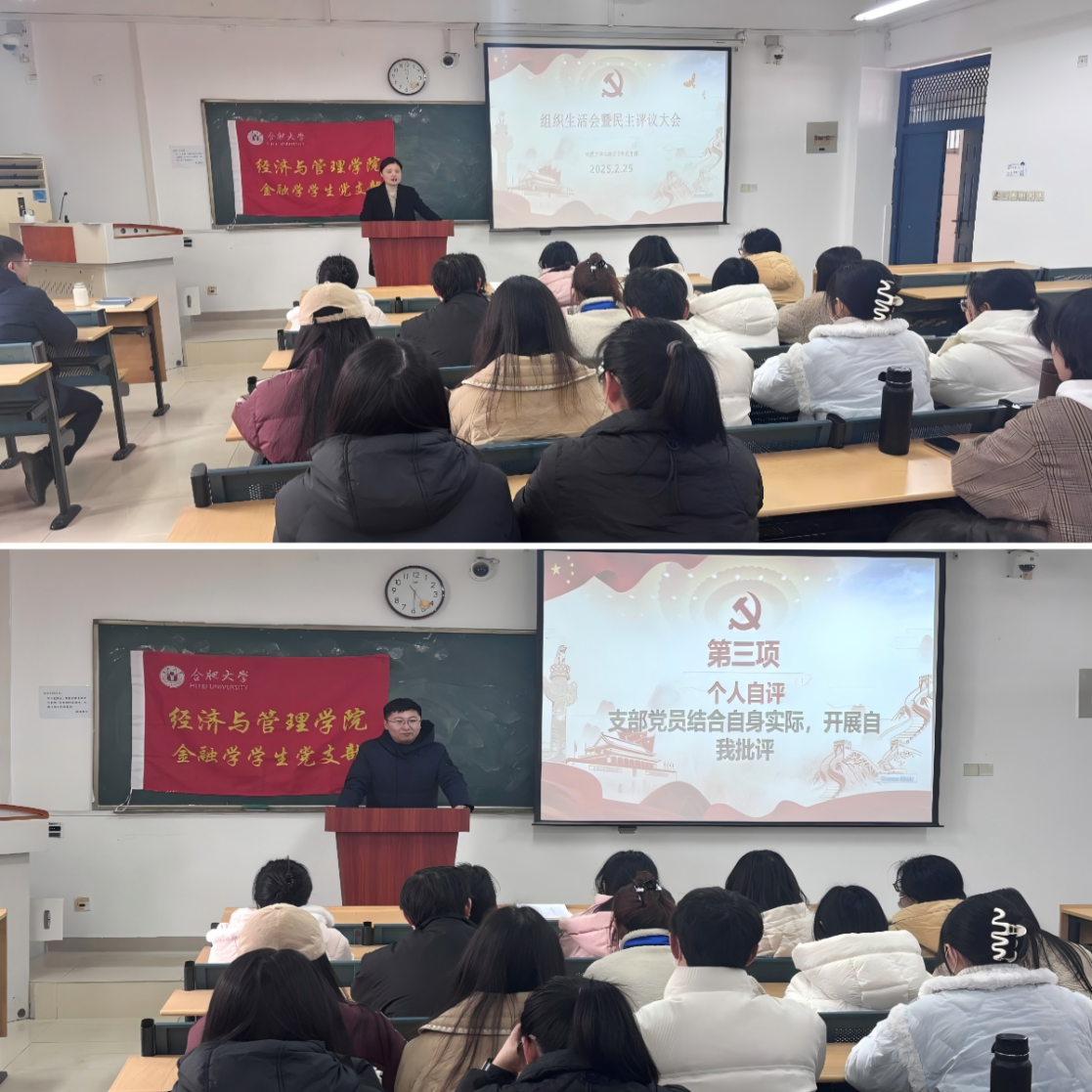 2月25日,經濟與管理學院金融學學生黨支部在4棟301教室召開2024年度組織生活會暨民主評議黨員會議。金融學學生支部黨員全員參會,學院黨委副書記夏丹青到會指導。 會上,黨支部書記陳維浩首先代表支委會作年度工作報告,總結支部在思想教育、學風引領、服務學生等方面成效。隨后,全體黨員結合大三、大四學生面臨的實際問題,嚴肅開展批評與自我批評。互評環節中,黨員們直指短板,提出“加強跨年級經驗分享”“提升專業實踐與黨建融合能力”等建議。 學院黨委副書記夏丹青充分肯定會議成效,強調會議聚焦學生黨員特點,問題查擺精準、整改措施有力。夏丹青結合支部星級評定情況指出,金融學學生黨支部在理論學習、支部活動等方面取得一定成果,但對標學院“五星級黨支部”標準仍存在差距,她強調,支部書記和支委要牽頭制定星級提升計劃,全體黨員要在學風建設、志愿服務中主動亮身份、樹標桿,助力支部星級晉位升級。