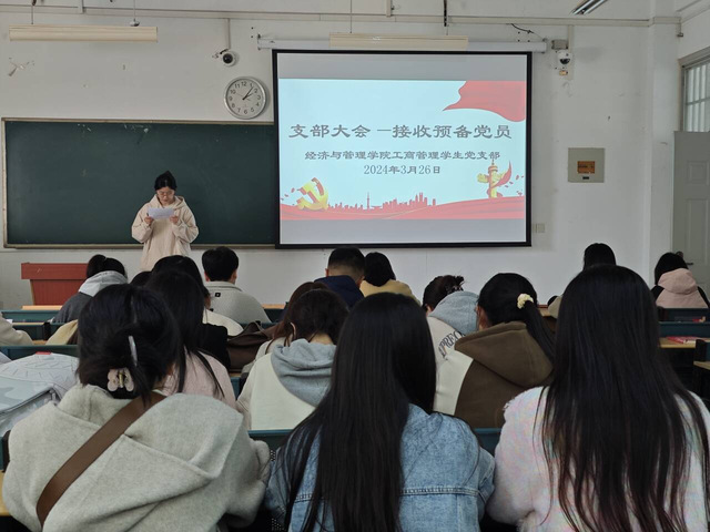 為響應黨中央號召,踐行黨的組織路線,深入推進黨員隊伍建設,2024年3月26日,經濟與管理學院工商管理學生黨支部在博學樓C座101室召開接收預備黨員支部大會,迎接方霞、許可兩位同志加支部大家庭。