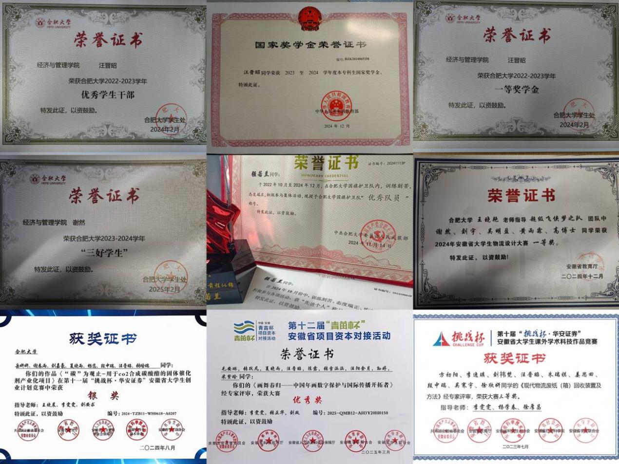 學習上,她們勤勉篤學,銳意進取。寢室長汪晉昭同學擔任班長、輔導員助理,連續兩年綜合測評位列班級第一,獲國家獎學金、校級一等獎學金,更以“優秀學生干部”“三好學生”“優秀團員”等稱號印證全面發展之路,她積極參加學科競賽并獲得省獎十余項、校獎二十余項,學習上認真刻苦,思想上積極向上,工作上嚴謹負責。謝然同學在班級擔任學習委員,曾任南艷青年新媒體中心主編,在學科競賽中斬獲安徽省物流設計大賽一等獎,獲校二等獎學金、三好學生、優秀團員等榮譽稱號,秉持著謙遜的態度,通過不懈的努力不斷進步。強若蘭同學作為班級生活委員,秉持著高度的責任心,細致入微地處理班級各項事務。在學校國旗護衛隊中,她憑借日復一日刻苦訓練磨礪出的過硬素質,從眾多隊員中脫穎而出,擔任副班長一職。訓練時,不僅嚴于律己,更主動幫助新隊員糾正動作、講解要領,以專業的指導和耐心的態度贏得隊員一致認可,獲評“優秀教員”稱號。此外,她在各項任務中始終沖鋒在前,以出色表現榮獲“優秀個人”表彰,成為校園里踐行愛國精神與責任擔當的榜樣。