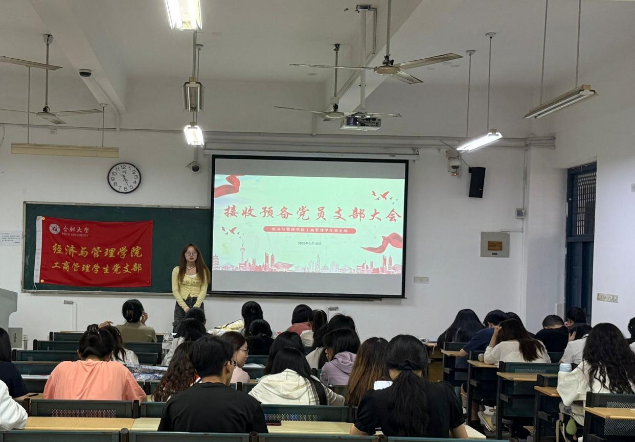 6月10日,經濟與管理學院工商管理學生黨支部在博學樓C座101室召開接收預備黨員支部大會,迎接許亞玲、張蝶等五名同志加入支部大家庭。