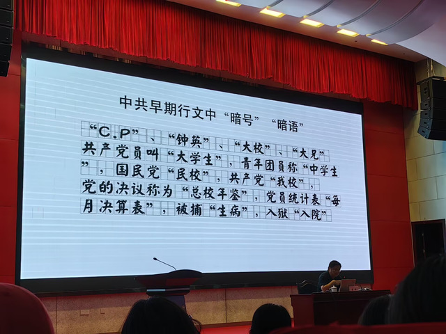黨課初始,賈峰老師回顧了中共一大轉移陣地的歷史。1921年7月,中共一大在上海法租界召開時突遭干擾,代表們在危急時刻轉移至浙江嘉興南湖繼續會議。這一轉移不僅是地點的變更,更是信仰在危機中的堅守。代表們臨危不亂,為了實現黨的創立這一偉大目標,在艱苦條件下完成會議,彰顯了對馬克思主義信仰的執著追求,為黨的隱蔽斗爭精神埋下了火種。隨后,賈峰老師提到中共早期行文中的“暗號”“暗語”,如“C.P”“鐘英”“大校”等,是地下工作者傳遞信息的關鍵。這些暗號不僅是簡單的代碼,更是同志們以命相托的信任紐帶。它們體現了早期地下工作者的智慧,也反映出信仰在隱蔽戰線上的深刻烙印,每一個暗號背后都是對黨的忠誠與信仰的無聲詮釋。