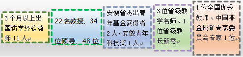學院現有專任教師與管理人員78人,其中教授22人,教授級高工程師1人,副教授23人,具有博士學位的教師48,碩士研究生導師34人,5名教授擁有超過10的企業工作經驗;全國優秀教師1中國非金屬礦專家委員會專家1,全國非金屬產品及其制品標準化技術委員會委員1人,省級教學名師3人,省級教壇新秀1人,安徽省杰出青年基金獲得者2安徽青年科技獎獲得者1安徽省優秀教師3,中國無機鹽工業技術創新先進個人1人,合肥市專業技術拔尖人才1人;具有3月以上出國經驗教師11人。