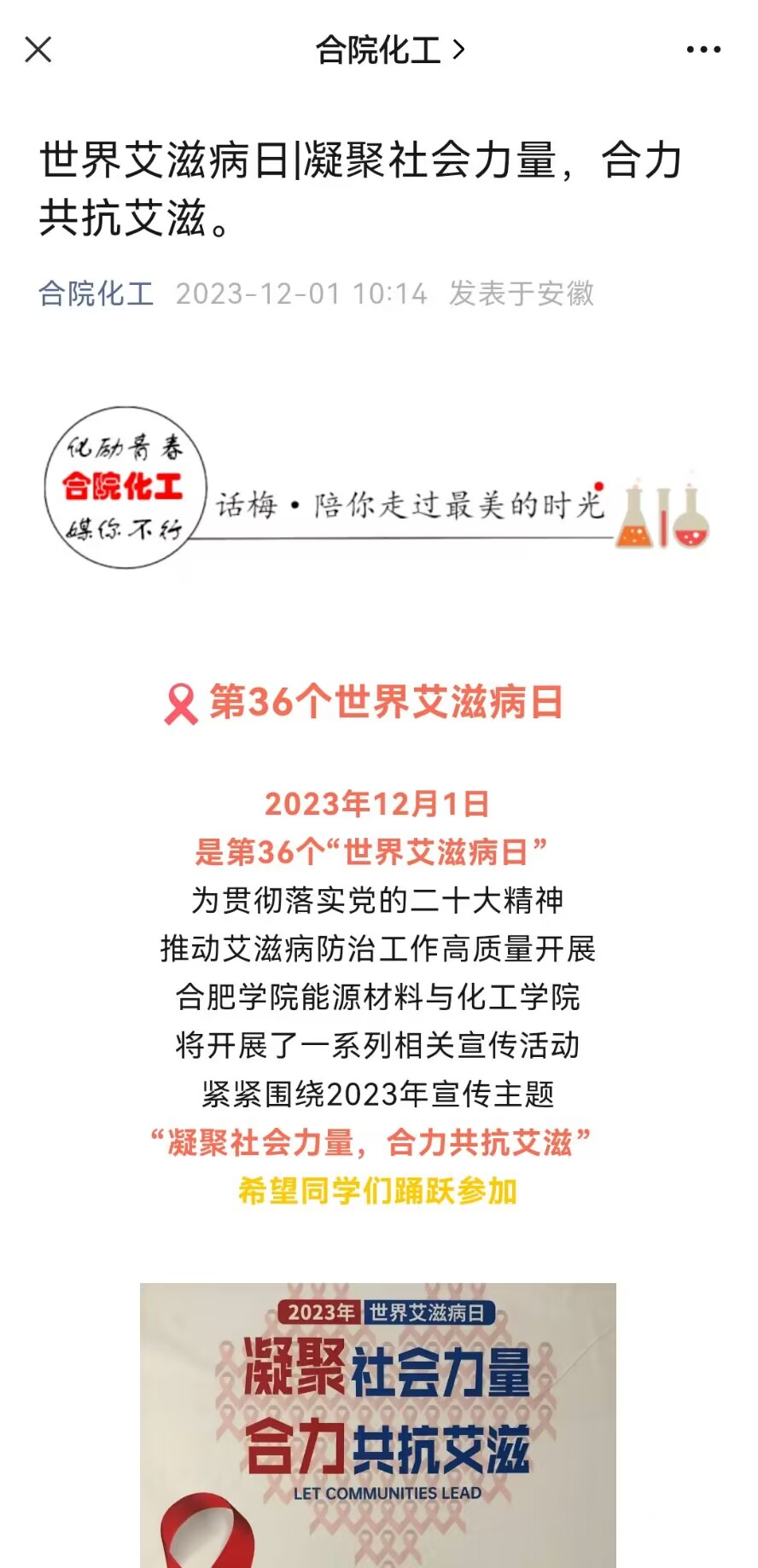 首先,我院微信公眾號“合院化工”平臺推文《攜手抗“艾”,讓世界充滿愛》,引導同學們了解艾滋、預防艾滋、關愛艾滋病受害者,共同守護自身和他人健康。
