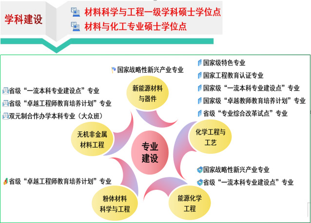 學院擁有碩士和學士二級學位授予權?,F有材料科學與工程一級學科碩士學位以及材料與化工專業碩士學位兩個授權,已形成了區域優勢明顯、目標明確的材料保護與安全、材料化工與環保、新能源材料與技術三個特色方向。現有化學工程系以及材料科學與工程系,分別設立化學工程與工藝能源化學工程2本科專業,以及無機非金屬材料工程粉體材料科學與工程新能源材料與器件2022年獲批)3本科專業?;瘜W工程與工藝業為國家級特色專業、國家級和安徽省一流本科專業建設點,并率先在全校通過教育部工程專業認證。能源化學工程無機非金屬材料工程專業均為安徽省一流本科專業建設點。學院與德國企業以及區域重點企業開展深度雙元制本科合作辦學和研究生培養,與大眾汽車(安徽)有限公司合作創辦無機非金屬材料工程(電池技術方向大眾班,也是我校大眾學院重點打造的本科專業之一。