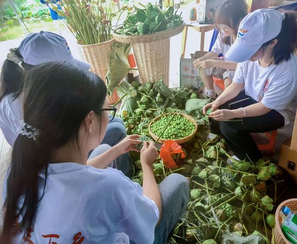 活動期間,志愿者們協助荷花基地開展豐富多彩的助農活動。在銷售線上荷花池烏篷船票的過程中,志愿者向游客們詳細介紹荷花池的盛景,耐心地解答游客們的各種問題;幫助農戶剝蓮蓬取蓮子,并積極宣傳和推廣荷花系列產品,幫助農戶拓寬銷售渠道,為農民帶來經濟效益的同時也讓更多的人了解到荷花文化的魅力。