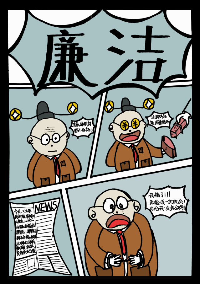 作品圍繞“反腐廉潔”進行創作,運用了三位手工藝人的形象對貪污腐敗的人進行反諷;將腐敗不正之風的人不會有的生活方式直接寫了出來,同時使用扁平畫的風格將生活中最樸素人物的真實的狀態表現出來,字體偏手寫風格,充滿親和力,“廉潔”兩字使用紅色更加突出。