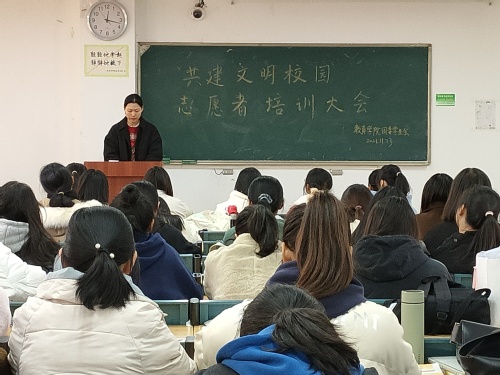 為進一步提升志愿者的服務意識和水平,增強志愿者的責任心,11月23日中午12:10于3棟301召開了共建文明校園志愿者培訓大會。參加本次大會的有共建文明校園活動負責人姜夢雅,志愿者八十余人。 會議開始前,志愿者們有序簽到、落座。會議伊始,由主持人姜夢雅介紹了本次共建文明校園活動和志愿者的工作職責,即食堂值班、電梯秩序維護、規范停車,及具體時間分配。除此之外,姜夢雅還講述了志愿者常遇的志愿問題和任務分配,并提醒志愿者注意志愿時間。在大會最后,又主動解答志愿者們的疑問,解決志愿者們的問題。本次培訓大會在陣陣掌聲中順利落下帷幕。 通過培訓大會,志愿者們不僅收獲了關于志愿活動和志愿服務的知識,而且還進一步增強了志愿者們的團結協作精神、無私奉獻精神,并且還深刻感受到志愿服務的重要性。教育學院志愿者們將靈活利用本次培訓大會的學習到的知識,為我校的發展貢獻自己的一份力量!(教育學院記者 呂新宇、孫卓月)