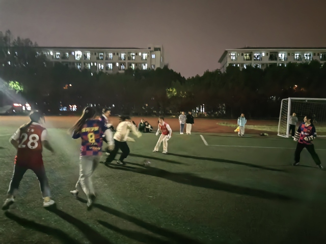 晚八點,隨著裁判的一聲哨響,雖然雙方球員都穿著單薄的球衣,但她們都克服了寒冷,在足球場上飛快的奔跑,并且雙方每個球員都渴望為隊伍拿下第一球,你來我往,互不相讓,使賽場的戰況十分焦灼。比賽過半,設計學院率先拿下本場比賽一球,但教育學院的球員并不氣餒,仍然沉著冷靜,并且互相鼓勵著,一起布下更為嚴密的作戰計劃。賽場上人員的快速移動,我方8號球員張妮,在隊友的掩護下,沖破對方的重重阻攔,踢進了教育學院第一球!這一球使得雙方比分打平,也使得教育學院球員情緒高昂起來,仿佛驅散了操場的寒冷。上半場臨近結束時,教育學院乘勝追擊,18號球員方蝶為教育學院再進一球!最終,上半場由2:1的成績結束。經過短暫的中場休息,球員們互相鼓勵著登上球場,觀眾們也在場下歡呼聲不斷。