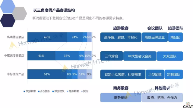 「客源需求特征」高端精品酒店吸引的旅游散客是那些有著“避世”需求的高凈值客源,且這部分客源也呈現出越來越年輕化的趨勢。會議團隊主要以高端品牌的新品發布會或客戶答謝會等為主,還有部分企業的高層會議及培訓等。旅游團隊主要以高端精品團或者海外國際團為主。中高端度假酒店則比較受到那些偕老提幼的三代家庭客源的青睞,因為這部分家庭更加享受酒店帶來的便捷周到的服務。團隊方面則以傳統的中大型會議會獎團隊及大眾旅游團隊為主。非標住宿產品因為其體量有限,因此不需要迎合所有類別的客源需求,只需要針對那些與其“調性”相符的小眾旅游散客客源,以及那些有社交需求,希望在旅途當中結交朋友的客源。非標住宿產品較為受到小型的公司團建活動及定制類旅游團的青睞,他們更加希望在活動期間能夠獨享整體非標住宿產品。