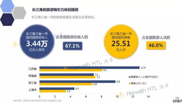 2018年長三角三省一市的國內旅游總收入占全國旅游總收入的67.1%,超過了三分之二,從旅游人次來看,占全國旅游總人次的46%,整體長三角地區的旅游吸引力依舊非常強勁,其旅游發展在全國占主導地位。
