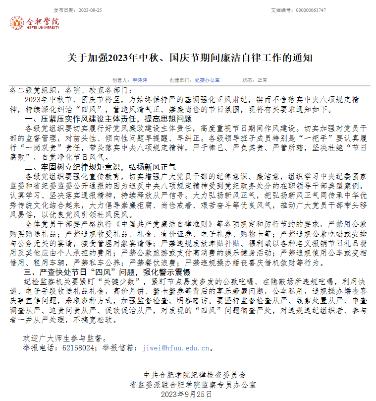 現(xiàn)將中共合肥學院紀律檢查委員會、省監(jiān)委派駐合肥學院監(jiān)察專員辦公室《關于健全和落實重大事件及時向上級有關部門報告制度的通知》轉(zhuǎn)發(fā)給你們,請認真學習領會,嚴格執(zhí)行有關規(guī)定。