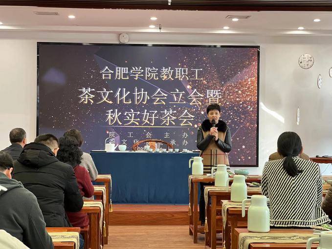 活動伊始,在旅游與會展學院教師袁夢如的主持下,本次活動順利拉開序幕。首先合肥學院工會主席宣文受邀上臺致辭,對教職工茶文化協會的建立表達祝賀與支持。隨后朱硯文老師與全體協會成員分享生活茶事美學,闡述了茶的歷史、發展和現狀,介紹茶的分類,六大茶類的特征,六大茶類的工藝三個部分。