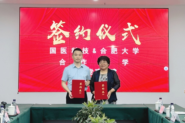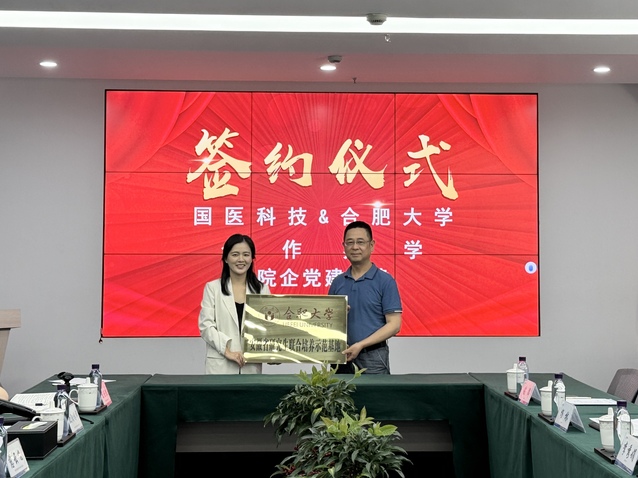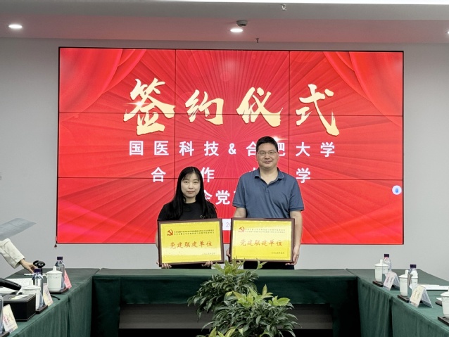 會上,雙方進行了“院企黨建聯建單位”、“國醫啟航班合作辦學”簽約儀式、“安徽省研究生培養基地”、“黨建聯建單位”授牌儀式,并對未來的發展進行交流溝通。