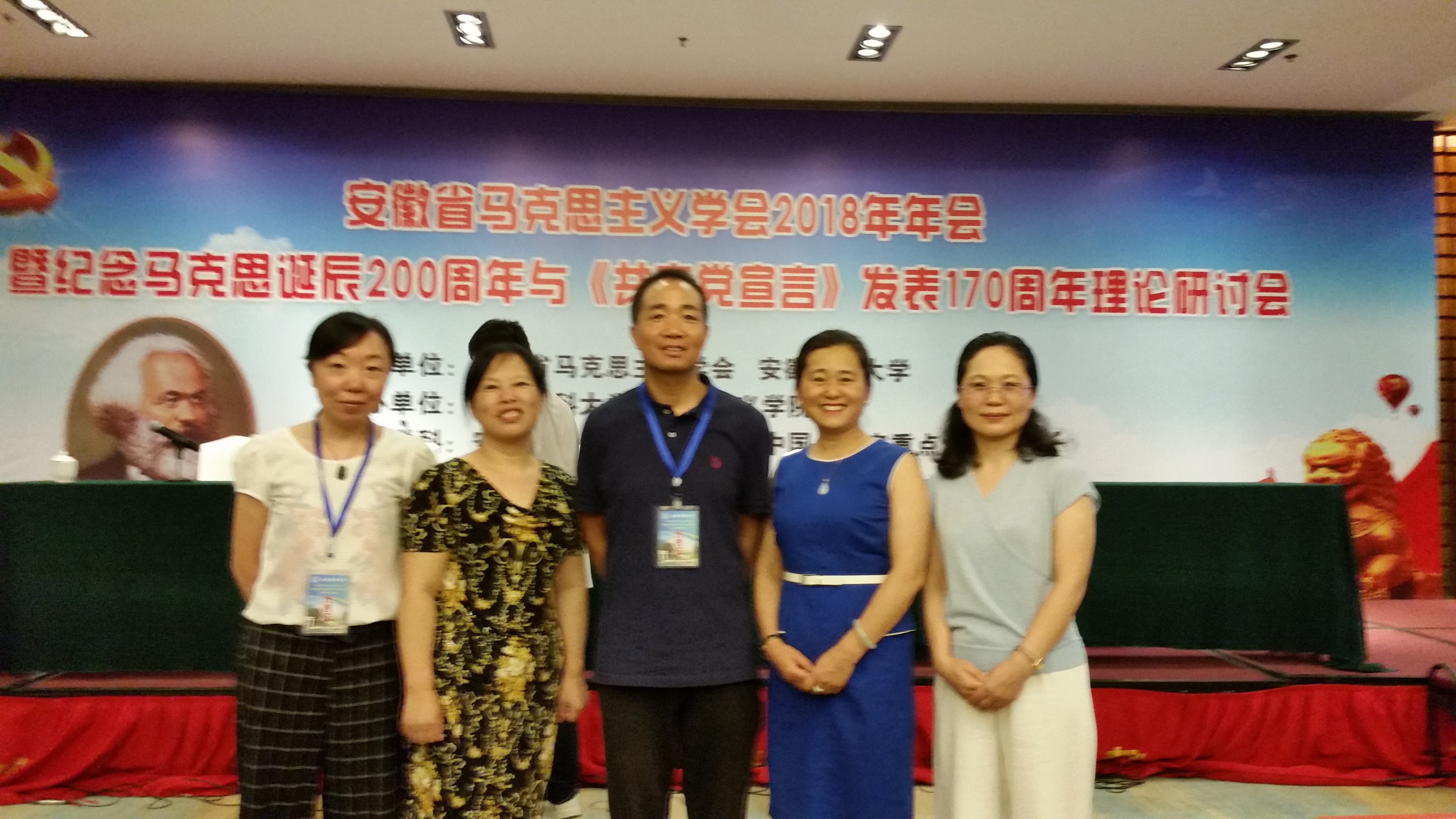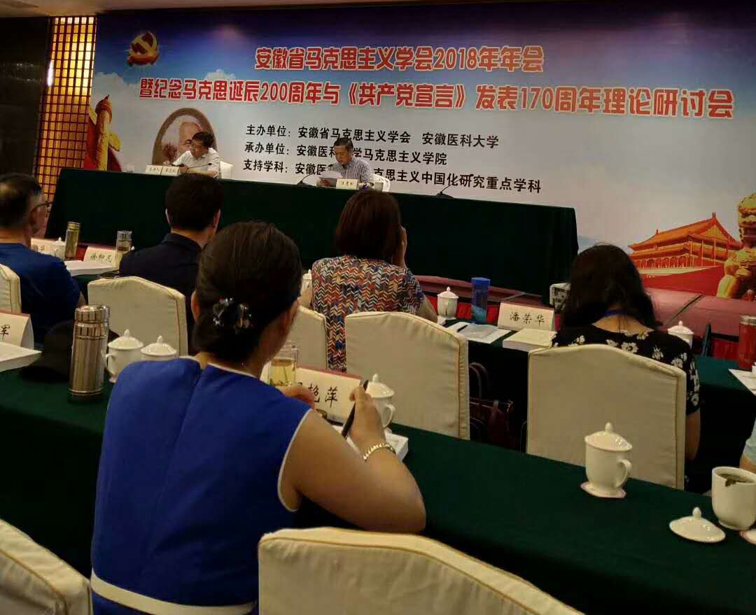 2018年7月13—15日,“安徽省馬克思主義學會2018年年會暨紀念馬克思誕辰200周年與《共產黨宣言》發表170周年理論研討會”在合肥梅山飯店舉行。馬克思主義學院胡艷萍、朱鳳琴、黃瑩瑩、蘇冰、王能引五位老師與會。