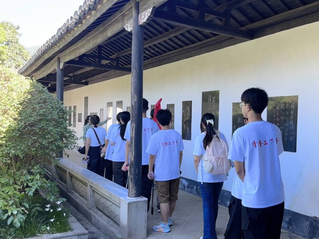 圖為講解員帶領(lǐng)團(tuán)隊(duì)成員參觀云嶺碑園內(nèi)長廊上的碑文題字 最后,團(tuán)隊(duì)走進(jìn)新四軍史料陳列館。館內(nèi)通過文獻(xiàn)、文物復(fù)原等,系統(tǒng)展現(xiàn)新四軍的光輝歷程。從組建發(fā)展到敵后抗戰(zhàn),從軍民攜手到英勇反擊,成員們在史料前駐足,對新四軍的歷史功績有了更全面的認(rèn)識。