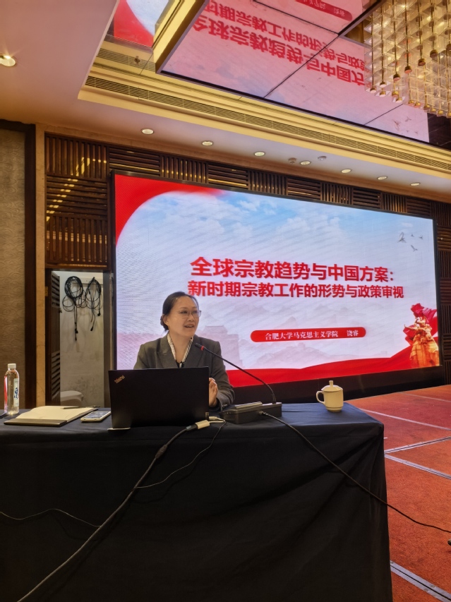 2025年11月14日上午,由中共合肥市委統(tǒng)戰(zhàn)部主辦的合肥市宗教界代表人士培訓(xùn)班在泓瑞金陵大酒店順利舉行。我院饒睿老師以《全球宗教趨勢(shì)與中國(guó)方案:新時(shí)期宗教工作的形勢(shì)與政策審視》為題,為全市150余名宗教界代表人士帶來(lái)了一場(chǎng)兼具理論深度與實(shí)踐價(jià)值的精彩分享。